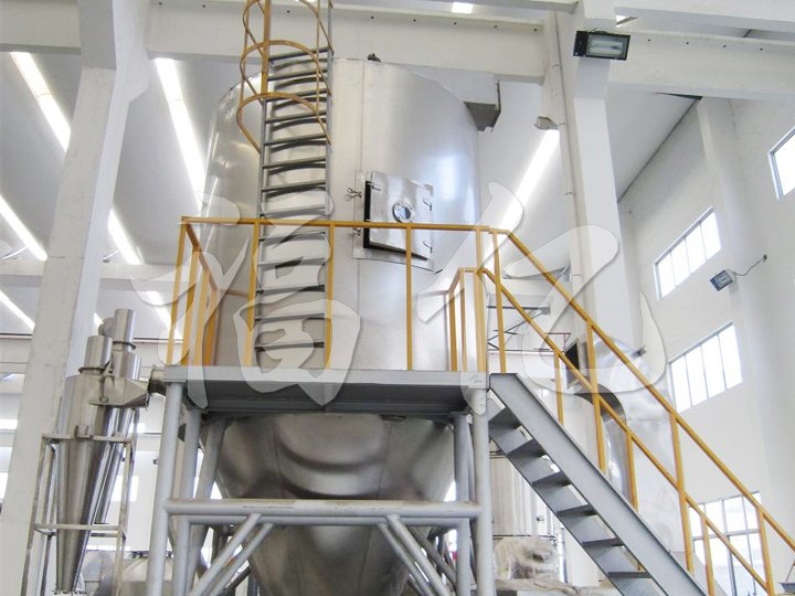 該機采用全封閉形式,所有部件均采用不銹鋼制造,配有三級凈化裝置,過濾后的空氣達十萬級要求。筒體與頂部裝有冷壁裝置,使壁溫<80℃,干燥塔內(nèi)裝有氣刷掃塔裝置。經(jīng)該機干燥后的中藥浸膏粉,不會出現(xiàn)焦化變質(zhì)現(xiàn)象,大大增加了收粉率(95%以上),而且不會產(chǎn)生混藥現(xiàn)象和粘壁現(xiàn)象。